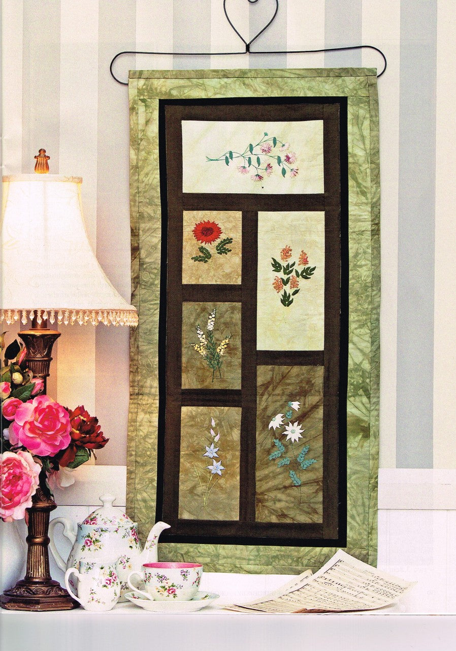 This Pattern contains fully illustrated pattern shhets for each of the flowers as depicted and a comprehensive illustrated stitch guide to the stitches used to create each flower. To purchase Rajmahal product used in this project please follow links 805-Sassafras 45-Baby Camel 521-Maidenhair 65- Laurel Green 121-Bluebell