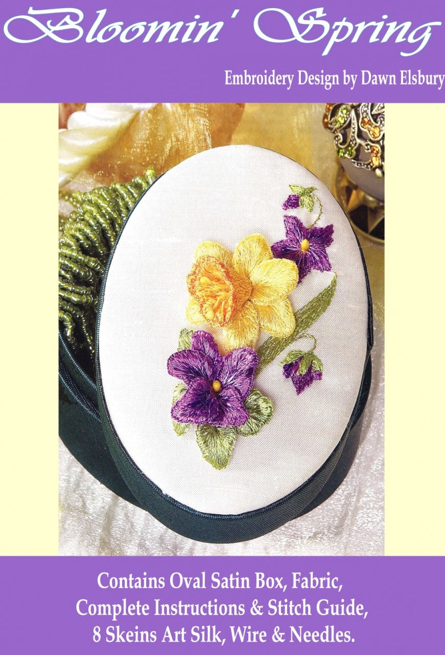 A beautiful spring design in mauves and lemon to suit a covered box.Kit contains needles, 8 shades Art Silk, fabric, wire, full instructions, stitch guide. Please note: BOX NOT INCLUDEDDesigned & Stitched by Dawn Ellsbury.Manufactured & distributed by Rajmahal.