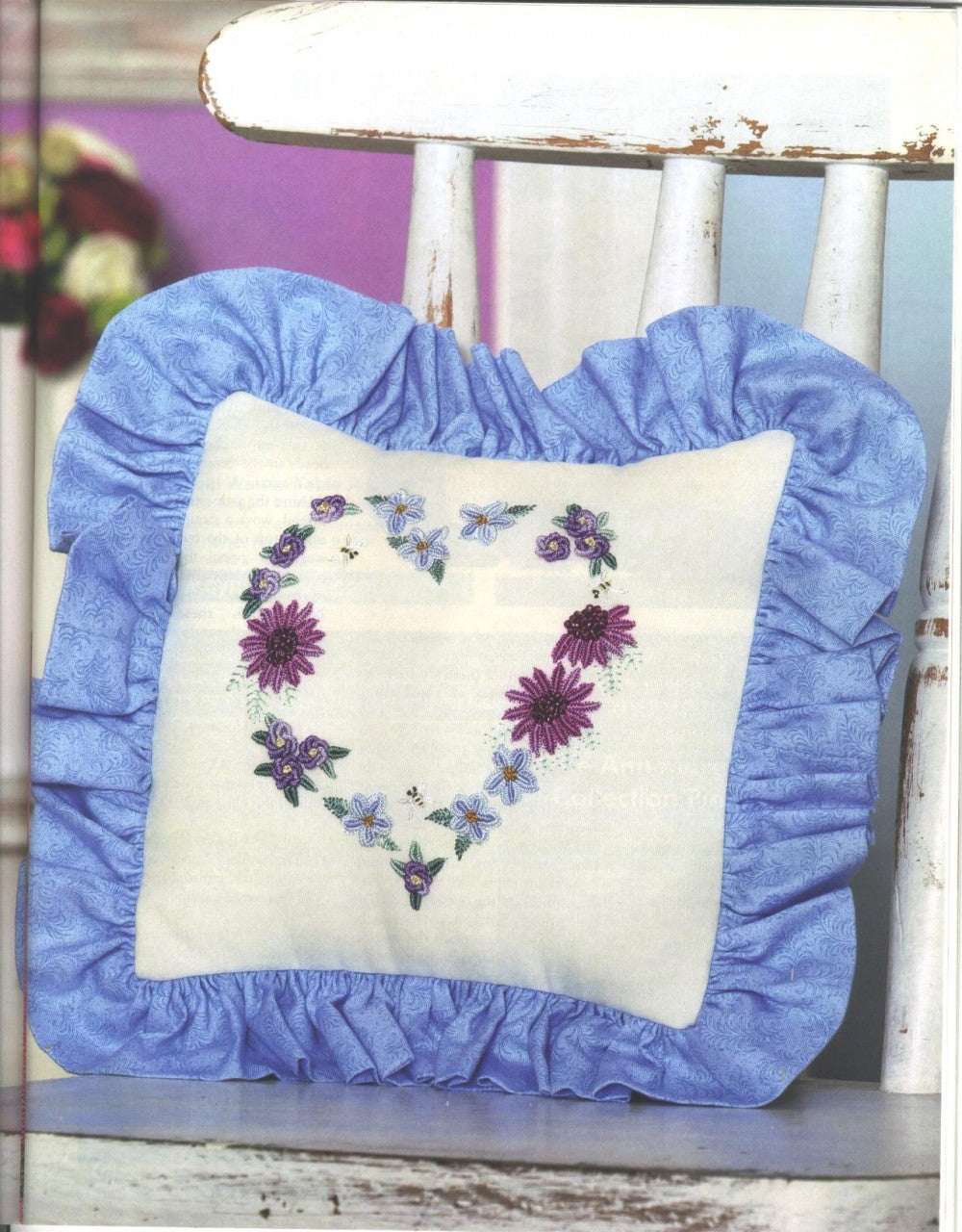 Ruth Marshall embellished this beautiful floral heart with delicate pastel shades. To purchase Rajmahl product used in this project please follow links. Rajmahal Art Silks 1 skein of 25 Lagerfeld Ink 91 Wheat Gold 201 Blue Alabaster