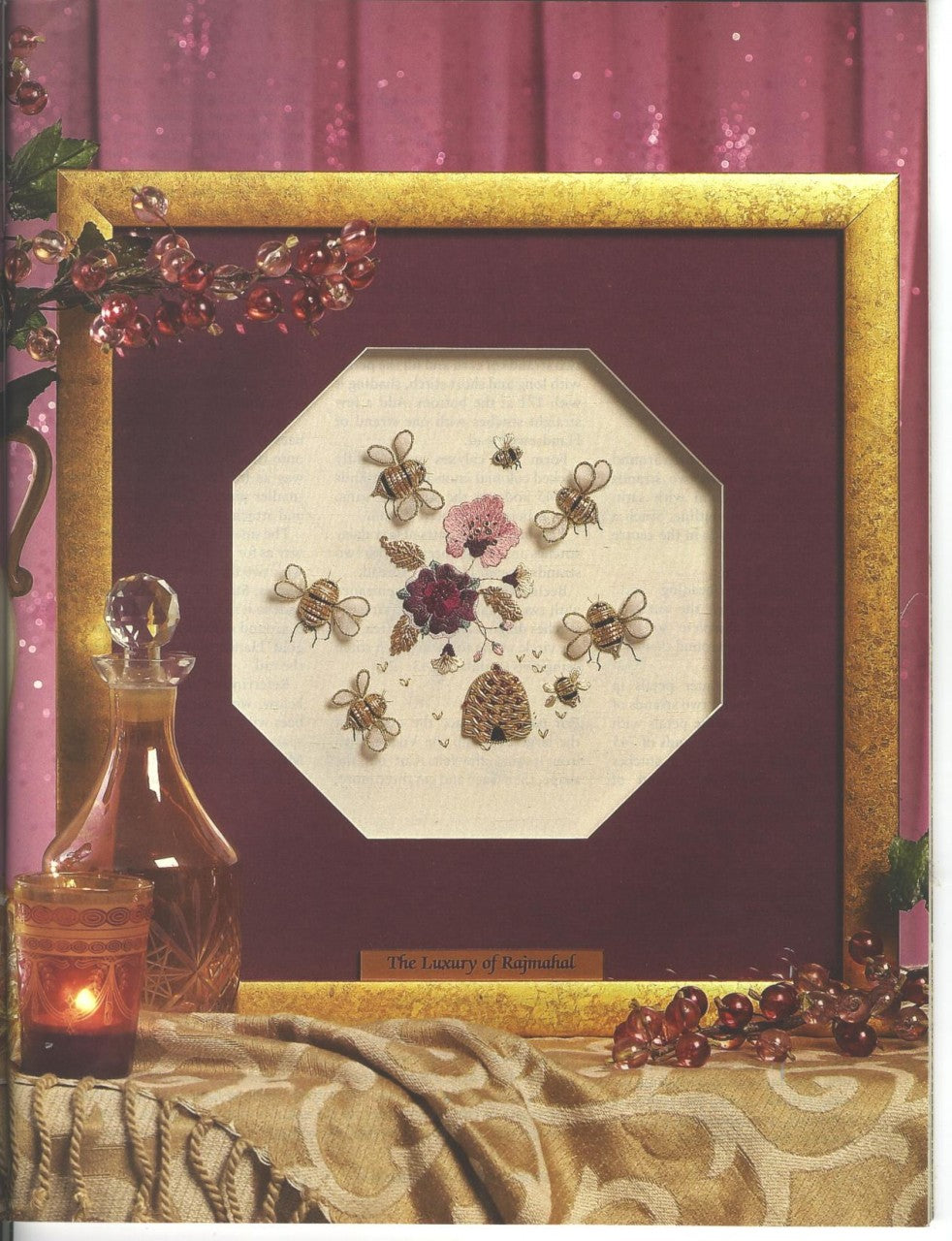 To depict the bees going about their endless circle of trips to the garden for nectar and back to the hive to store it,Irene Junkuhn combined surface stitchery,goldwork and stumpwork techniqes. To purchase a kit of this project please follow links Busy Bees Kit to learn more on how to Use Art Silk & how to Use Sadi Threads