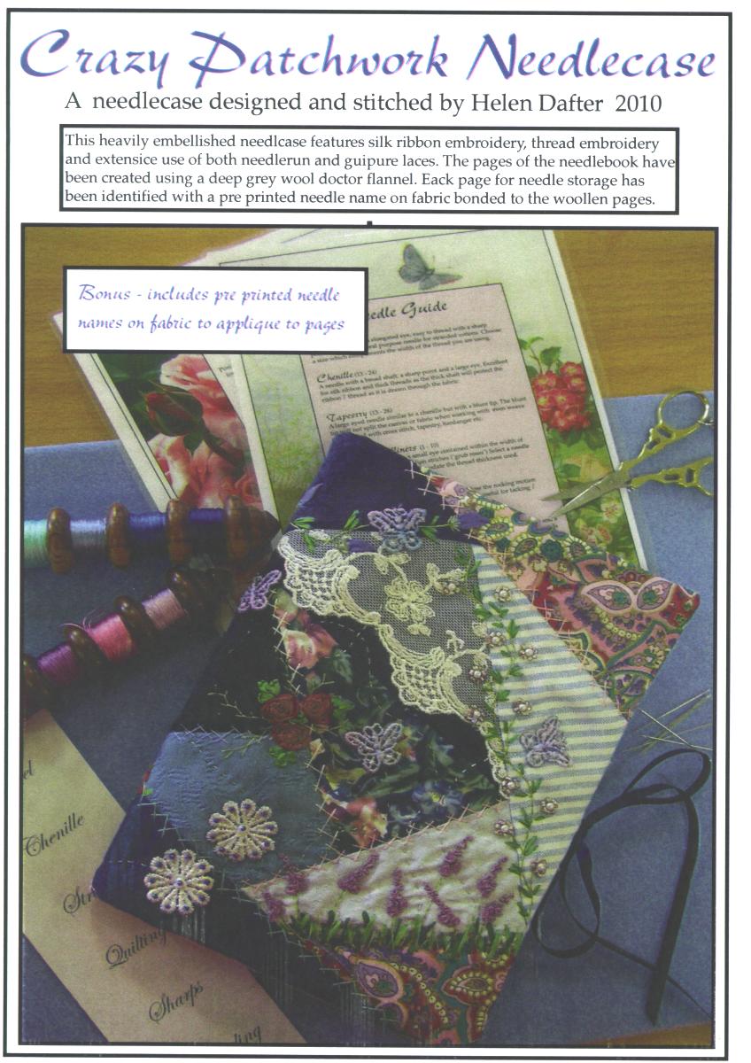This heavily embellished needlecase features silk ribbon embroidery,thread embroidery. This pattern includes pre-printed needle names on fabric to apply to pages.