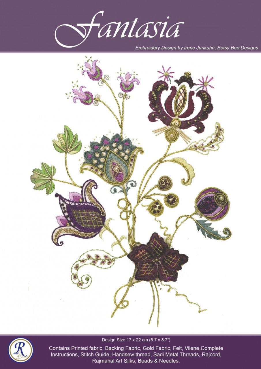 A truly stunning design that is a pleasure to stitch. As seen in Stitch UK issue 40 Team Fantasia with Jacobean Fanasty for the perfect pair. Designed by Irene Junkhun Each kit contains Printed Fabric, Backing Fabric, Complete instructions,Stitch Guide, Rajmahal Art Silks, Gold Sadi Metal Threads, Gold Rajcord, Gold Handsew Metal Thread, Felt, Gold Fabric, Vilene, Wire, Beads and Needles