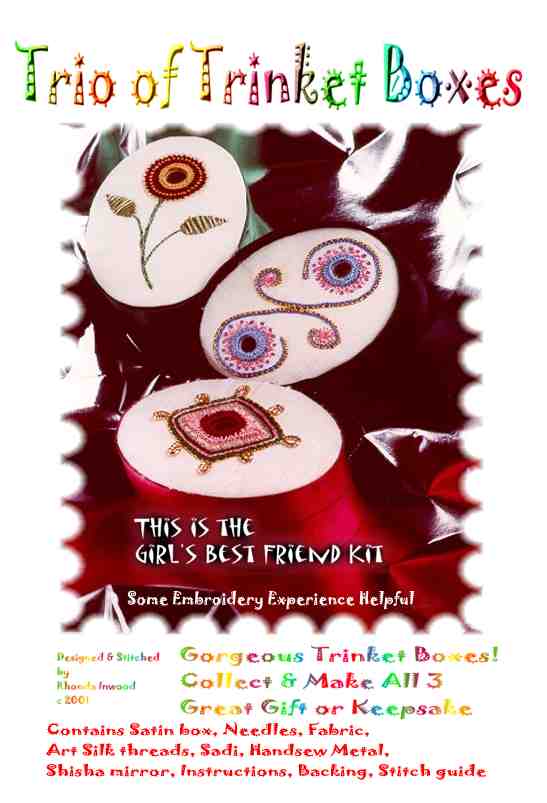 Contains Needles, Fabric, Art Silk threads, Sadi, Handsew Metal, Shisha mirror, Instructions, Backing, Stitch guide.Size - 8.9cm X 6.4cm (3.5in X 2.5in) Please Note: Kit does not contain box