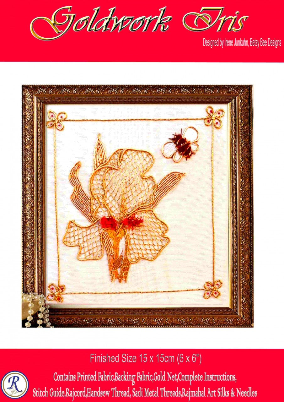 Design Size: 15 x 15 cm Contains Printed Fabric, Complete Instructions, Gold Sadis, Stitch GUide, Gold Thread, 5 Art Silks, Net, Gold Cord & Needles Embroidery Design by Irene Junkuhn, Betsy Bee Designs