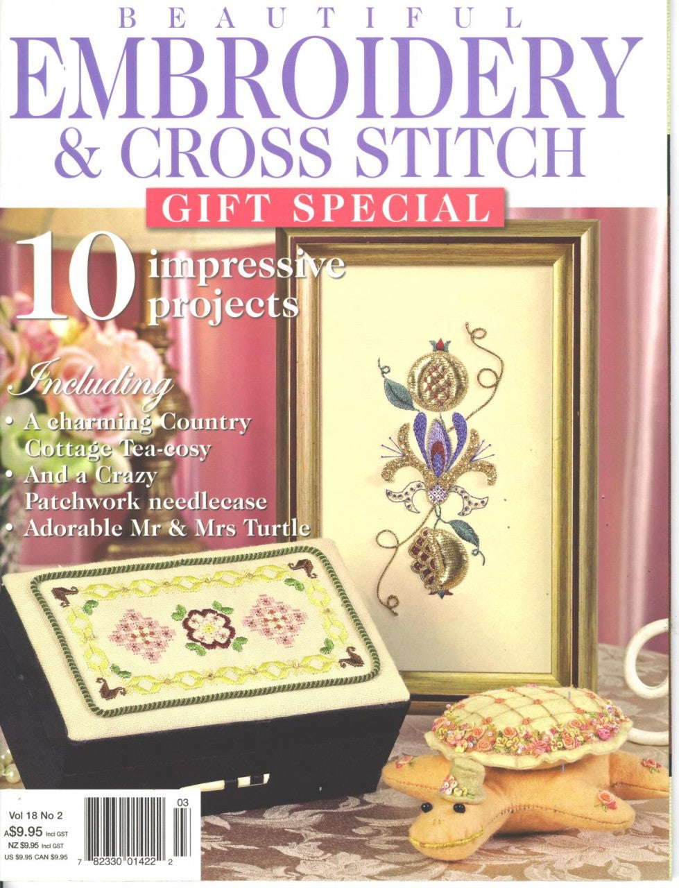 This attractive and ornate fruit and flower design lends itself beautifully to Goldwork embroidery. Irene Junkuhn's design shows how sadi metallic threads complement the rich colours and lustre of Rajmahal Art Silks. Kit Available ( Satin Box not included) To purchase a kit of this project please follow link Honeysuckle and Pomegranates-Kit