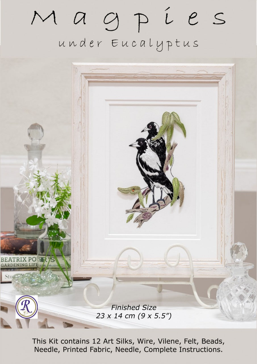 Magpies Stitched Jan Seeley, from a design by Keith Lamb and Marie Dryden, Artwork By Hadyn ….. Design measures 23 cm x 14 cm Your Kit Includes: Printed Fabric 30 cm x 30 cm Backing Fabric 30 cm x 30 cm 1 Skein each of Rajmahal Art Silk Threads 25 Lagerfeld Ink 29 Charcoal x 2 96 White 175 Earth 221 Pastel Grey 251 Hot Orange 311 Fresco Oil 421 Green Earth 521 Maidenhair 745 Bordeaux 841 Gilded Bronze Needle Embroidery: Size 9 Wire: 150 cm for Stumpwork Felt: 15 cm x 10 cm Vilene 15 cm x 10 cm Calico 2 pieces 15cm x 15cm Beads 2 small black seed beads Stitch Guide and Complete Instructions