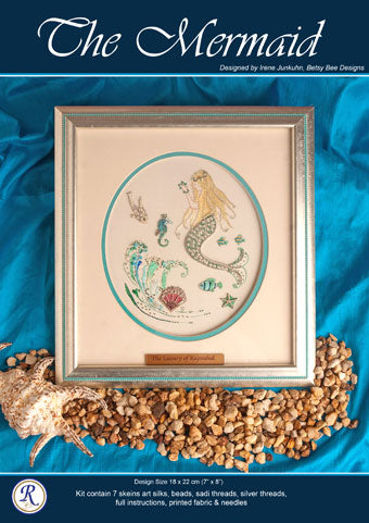 This Silver Mermaid is a delight in sadi spangles and glistening art silks with silver embellishments Simple to stitch, stunning effect! Finished Size: 18 x 22 cm (7 x 8in) Kit contains 7 skeins art silks, beads, sadi threads, silver threads, printed fabric &needles, full instructions Embroidery Design by Irene Junkuhn *** some experience needed