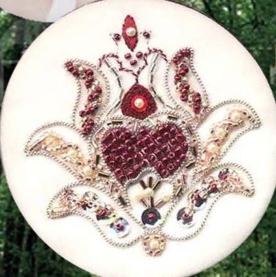 Stitch & Bead Size 130mm diameter (5in) Contains Printed Fabrics, Complete Instructions, Silver Sadi, Stitch Guide, Gold Thread, 5 Art Silks Beads, Silver Metal threads & Needles NB Box is not included.