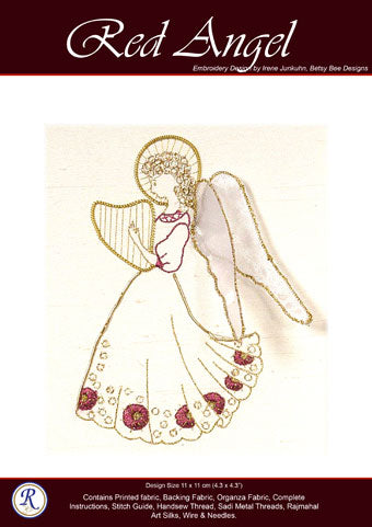 Design Size: 11cm x 11cm Contains Printed Moire Fabric, Complete Instructions & Stitch Guide, Gold Sadi, Gold Metal Thread, Wire, Organza, Art Silk & Needles. Embroidery Design by Irene Junkuhn, Betsy Bee Designs **a little experience needed