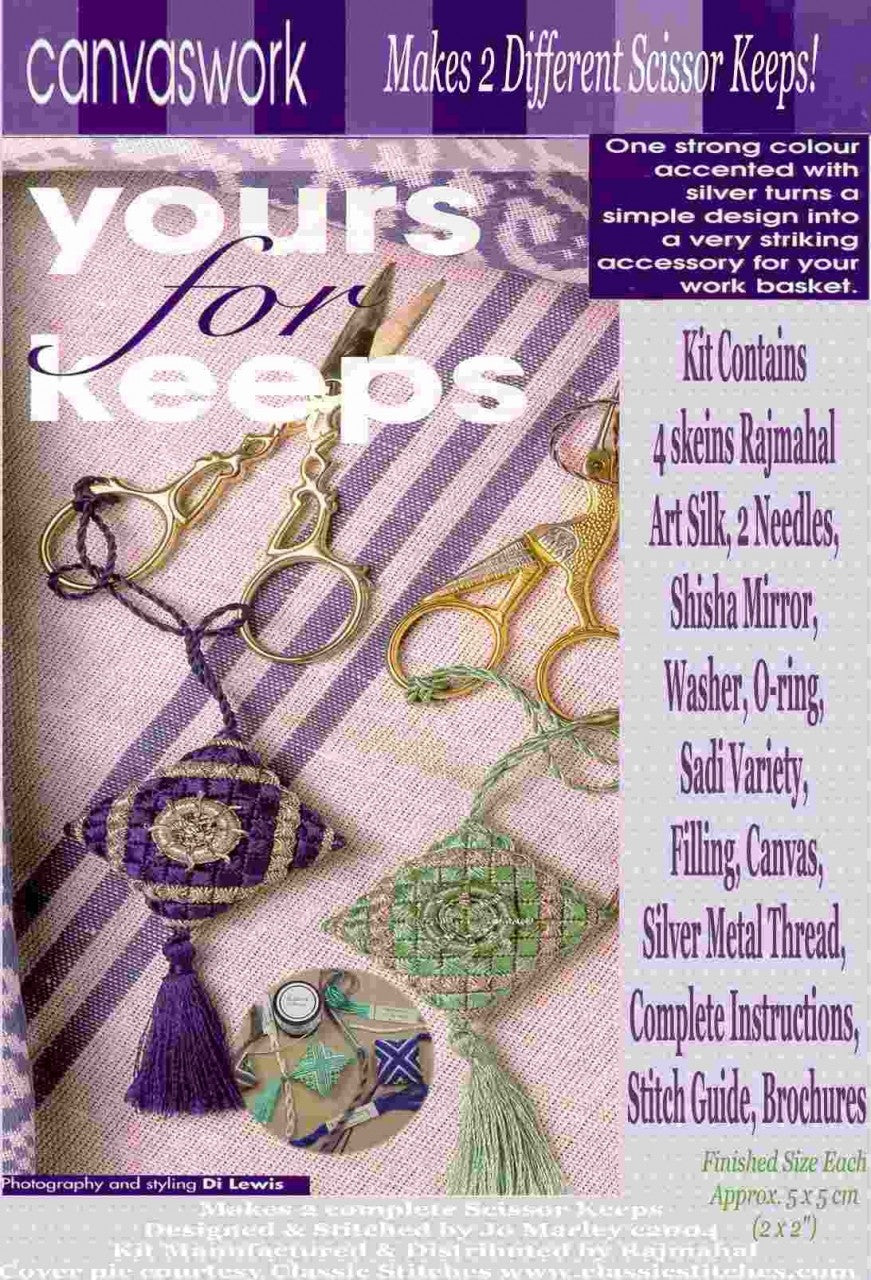One strong colour accented with silver turns a simple design into a very striking accessory for your work basket. Kit contains all requirements to make both pictured keeps. SImple but stylish stitching with varaitions you may apply if desired. Rajmahal Art Silks, Needles, Shisha Mirrors, Washer, O-ring, Sadi Metal Threads, Canvas, Fibrefill. Clear and Complete instuctions with illustrated Stitch Guide.