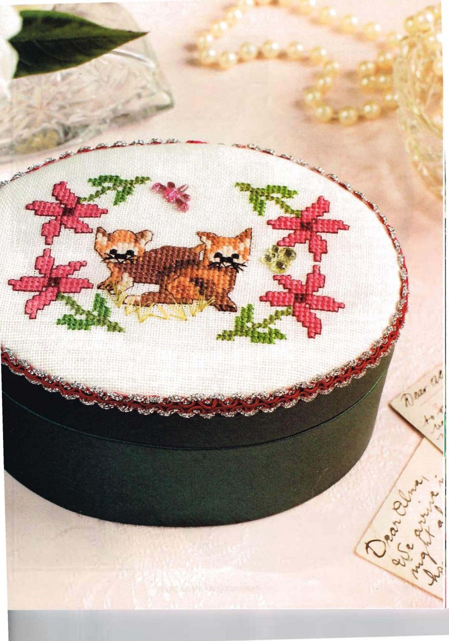 These cute little kittens on this lovely satin box were designed and stitched by the very creative Sibille Kreidweiss