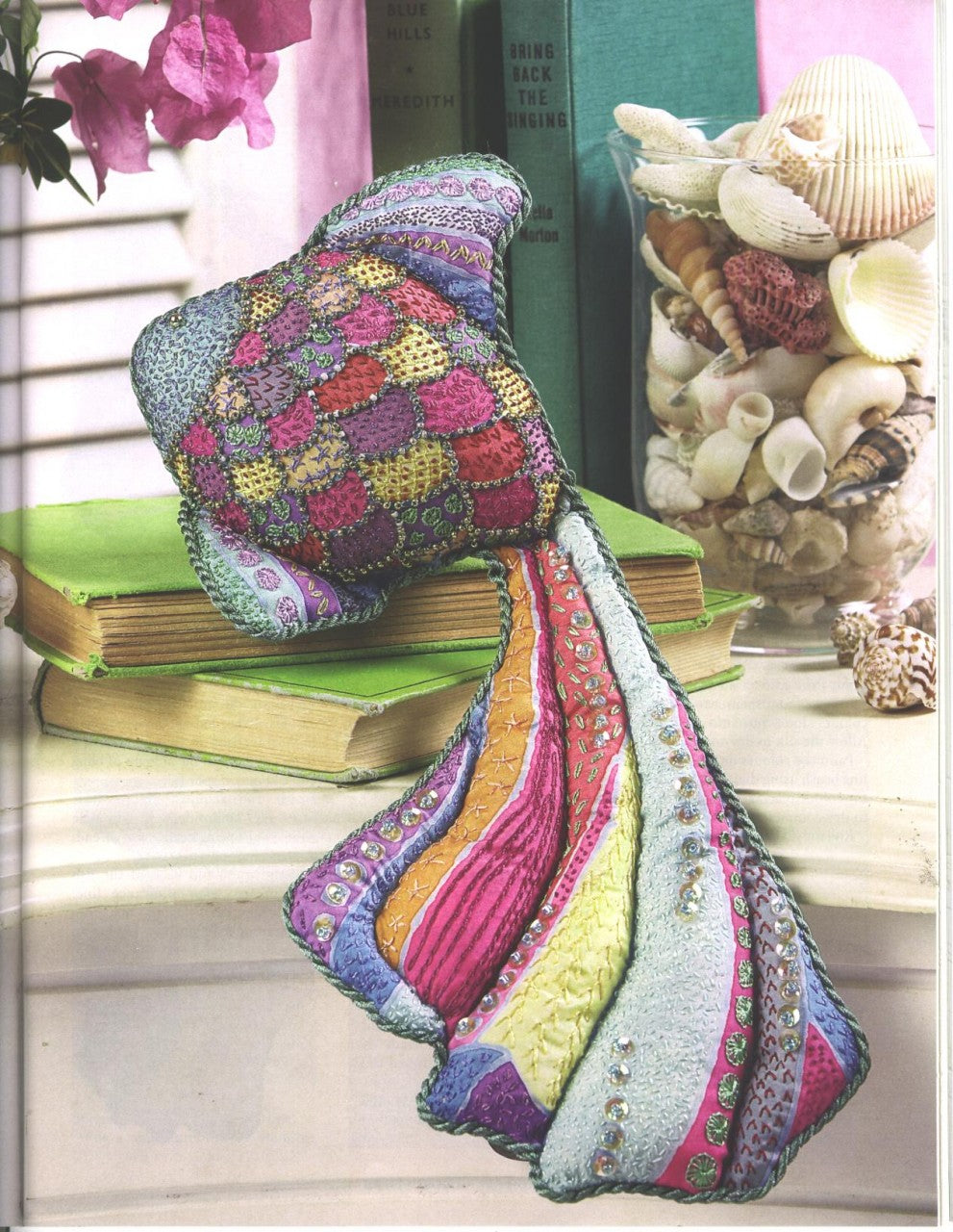 Wonderful colours are painted on silk, then embellished with shimmering embroidery, beading and sequinsto make this fish. Use it as a paperweight or simply sit it on a shelf to be admired. To purchase Rajmahal product used in this project please follow links. Rajmahal Art Silk 1 skein of 45 Baby Camel 94 Moroccan Gold 111 Danity Lilac 113 Purple Dusk 122 Cossack Blue 161 Alpine Spring 184 Vibrant Musk 231 Apricot Cream 255 Vermilion 256 Hot Plum 786 Blue Heaven 805 Sassafras 3 Skeins of 926 Verdigris