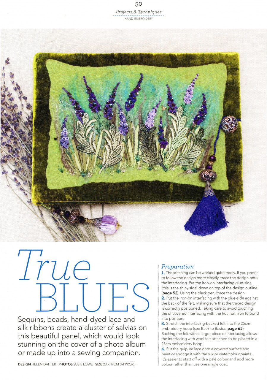 Helen has created a stunning design stitched onto wool felt featuring silk ribbon, Rajmahal threads and hand-dyed Guipure Lace to showcase a beautiful garden of Salvias. Turn this into a lovely needle keep or create the perfect gift of a diary cover or Tablet cover, this project knows no limits.