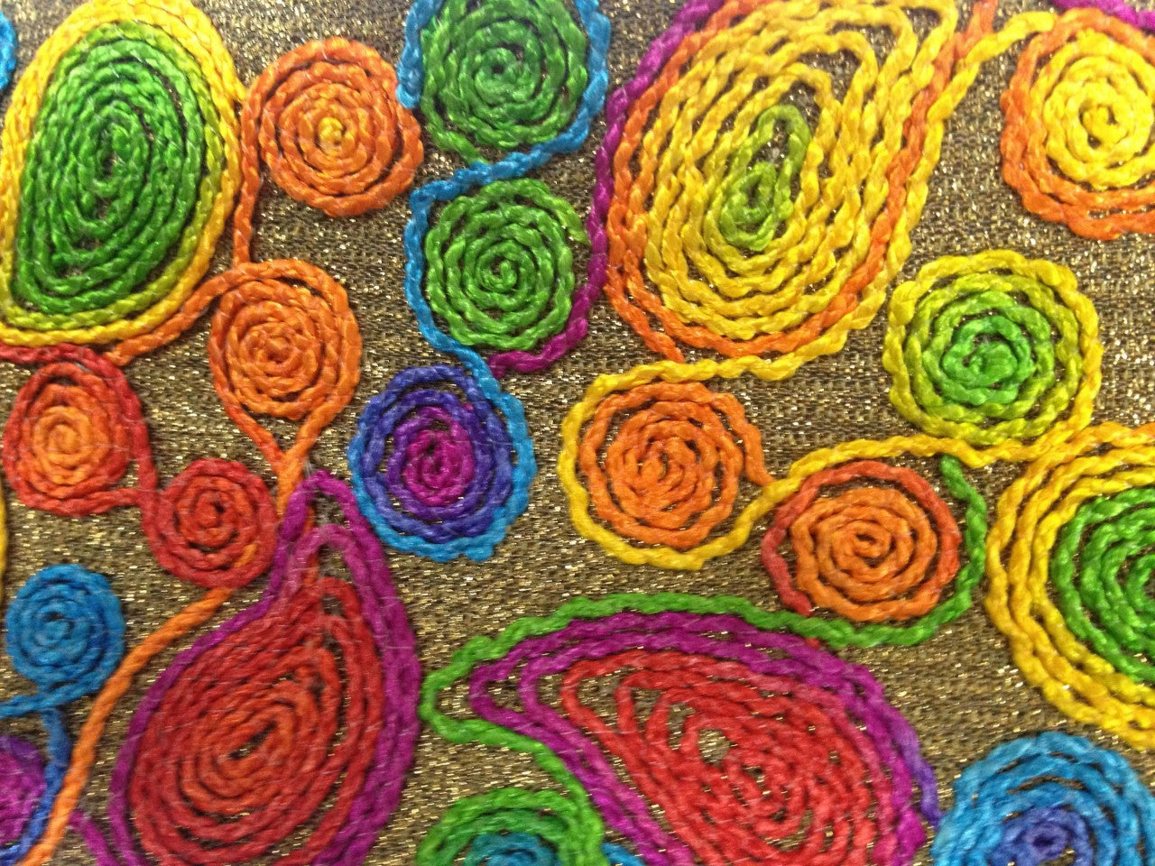 This gorgeous Woodstock Braid is 80cm wide and features chain stitched circles and paisley shapes worked in cotton on bronze metallic weighted fabric.