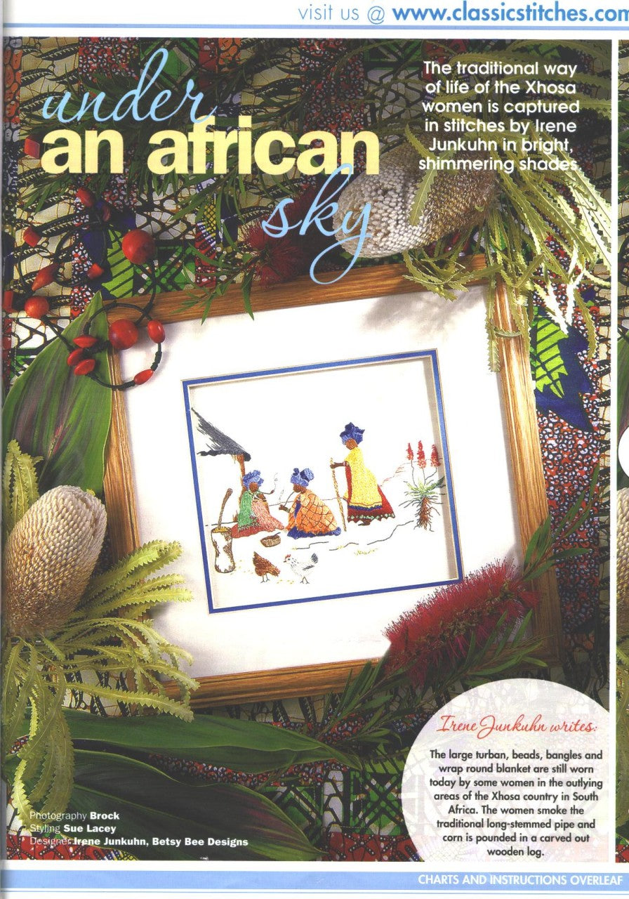 The Traditional way of life of the Xhosa women is captured in stitches by Irene Junkuhn. The large turbans,beads,bangles and wrap rpund blankets are still worn today by some women in the outlying areas of Xhosa Country in South Africa. The women smoke the traditional long stemmed pipe and corn is pounded in a craved out wooden log. To purchase a kit of this project please follow links. Xhosa Women